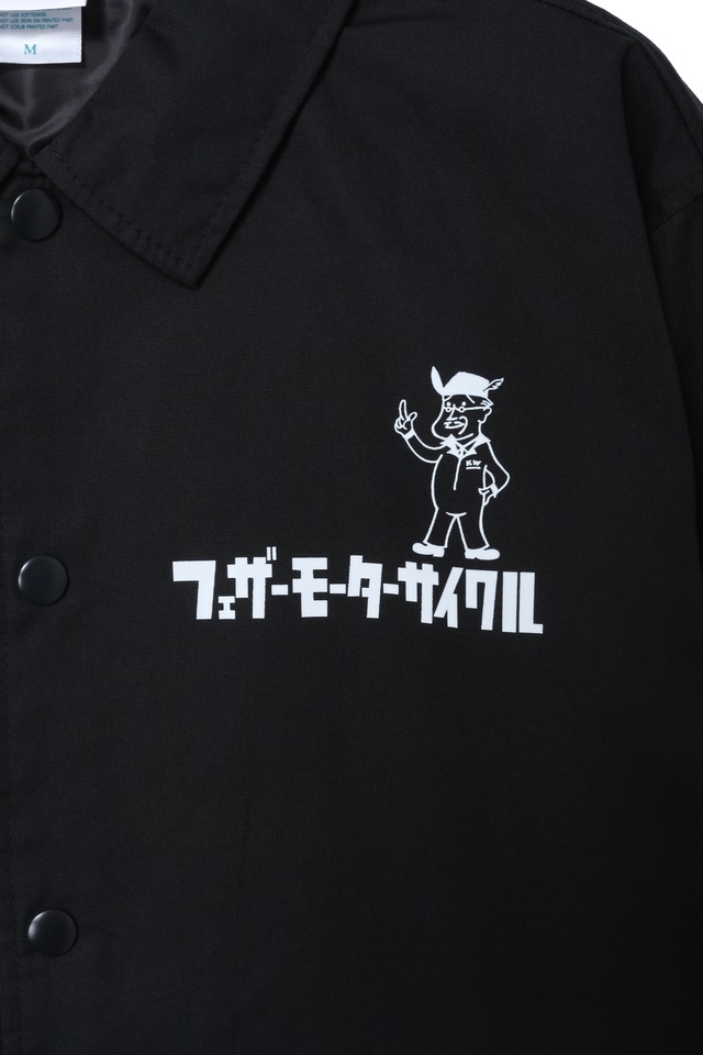当店オリジナルT/Cコーチジャケット 胸には限定Featherおじさん、背中にはドカーンとFeatherロゴを 取り入れました! T/Cウェポンと言うポリエステル65%、コットン35%で高密度に織られた生地 コットンが入る事で、通称のナイロン100%のコーチジャケットより耐久性が大きく上がります。 撥水もするし風も通さない、裏地はあるけれど中綿は入っていないのでインナーの着こなしによって年中活躍します。